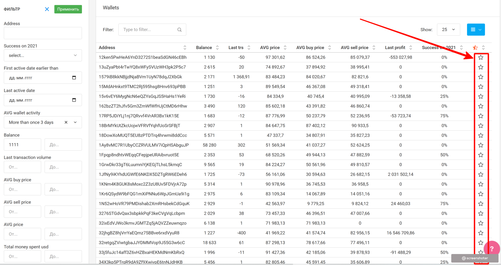 Механика работы предельно проста: фильтруем слева данные (1), справа получаем список конкретных кошельков (2). Затем добавляем в избранное кошельки.