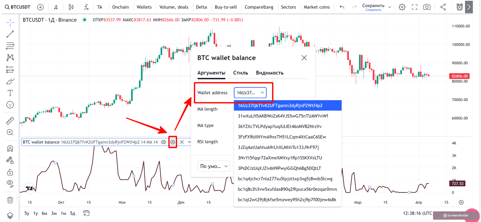 Остаётся выбрать нужный вам кошелёк и просмотреть его на привычном и удобном графике со всеми возможностями tradingview.