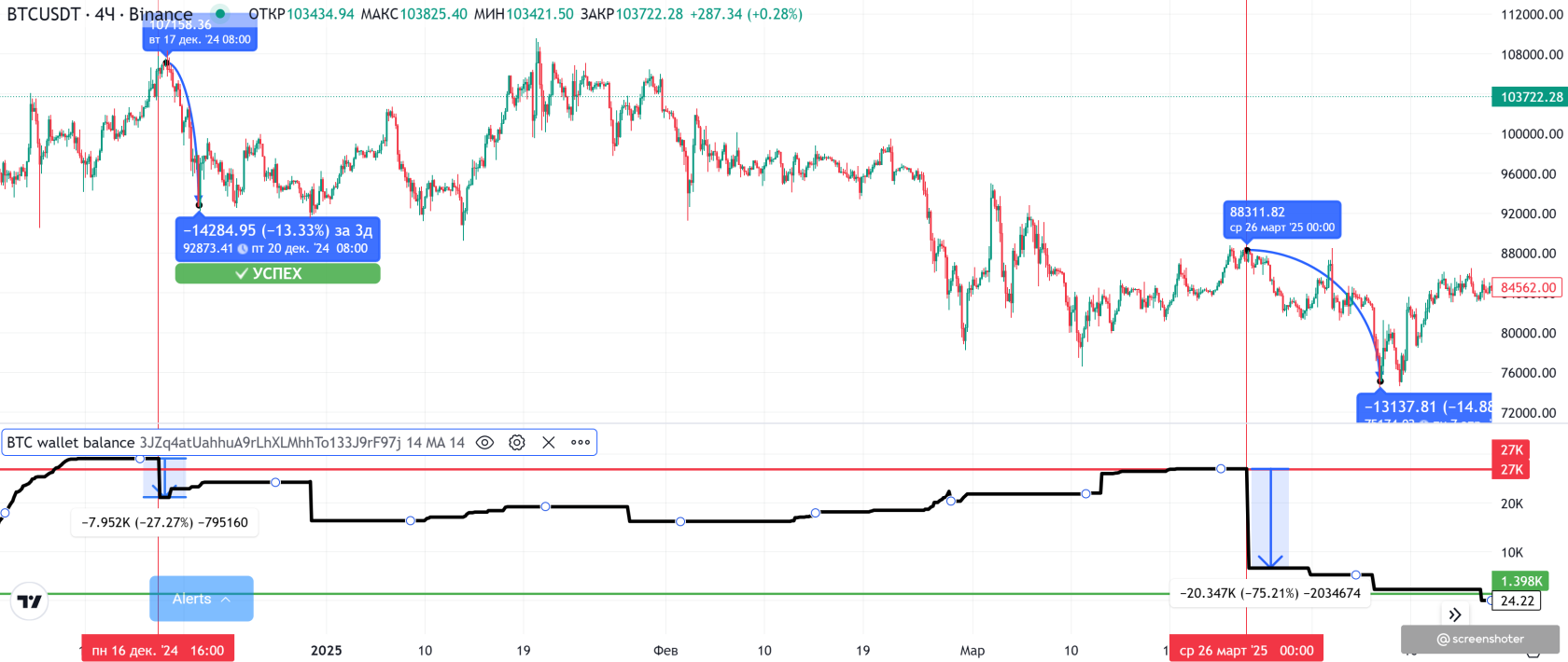 На картинке видно, что этот кошелёк накапливает в своём активе обычно 27 000 биткоинов, что часто является его локальным максимумом. Обратите внимание, что когда он резко «сбрасывает» баланс с этого числа на 27% и более, то мы можем трактовать это, как мнение кита о предстоящей коррекции на 13-14%.