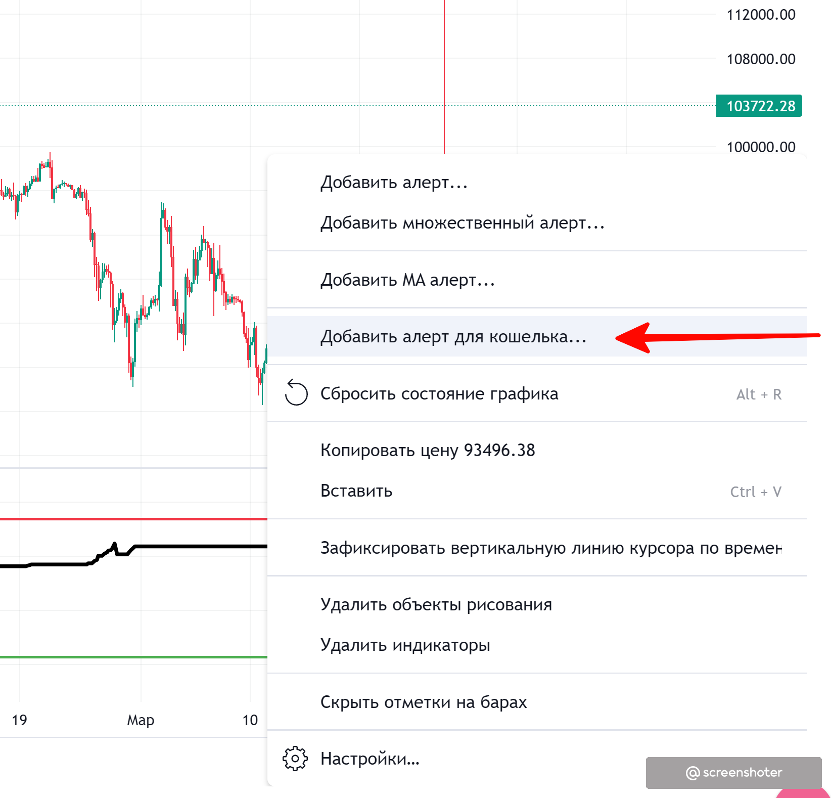 1) Сначала кликните правой кнопкой мыши в любом свободном месте на графике и выберите в раскрывающемся меню «Добавить алерт для кошелька»