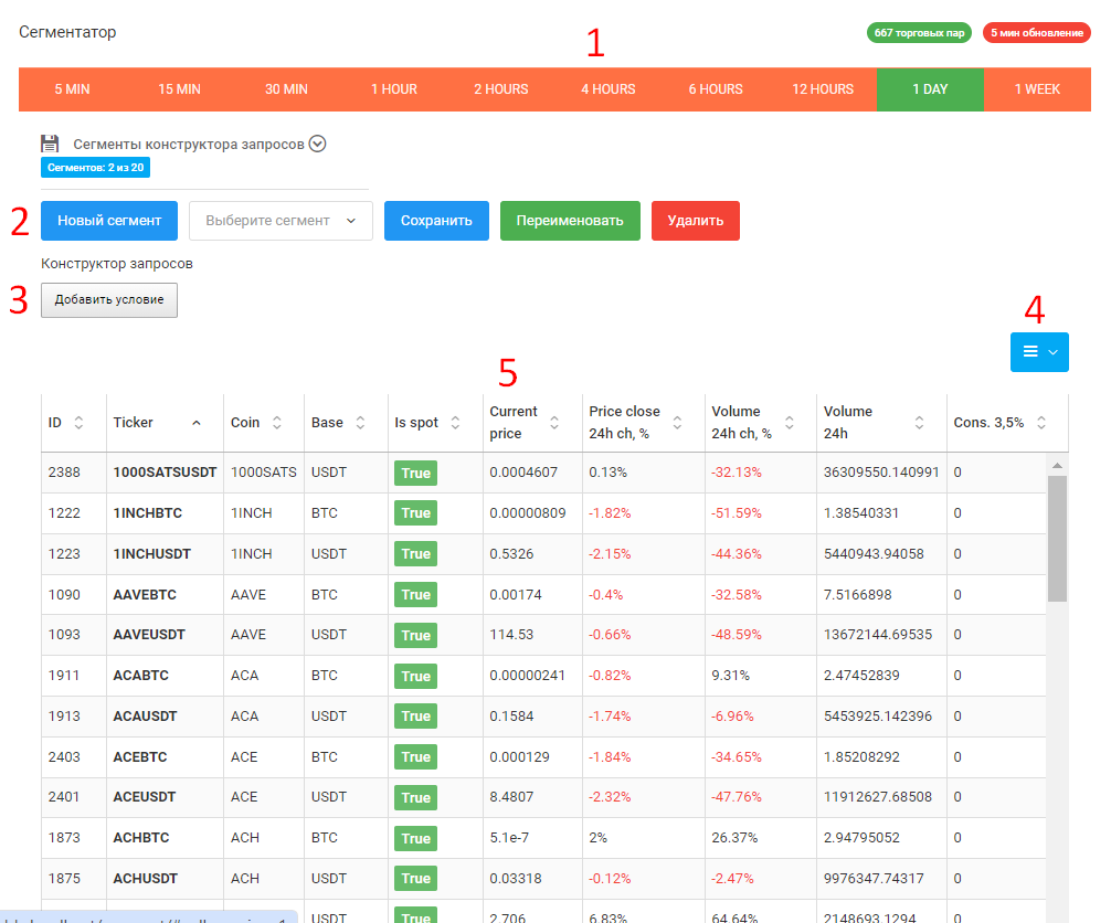 Модуль Сегментатор предназначен для создания сегментов рынка криптовалют основанных на фильтрации параметров(индикаторов) монет на текущий момент времени. Особенно удобен для тех, у кого есть своя торговая стратегия и понимание, с какими именно торговыми парами нужно работать. К примеру, у вас может быть самый простой сегмент пар, который нацелен на консолидации на дневке и зашкала покупок на текущем тф. У сегментатора нет алертов в отличие от Графика или Трекера, но он идеально подходит для снятия быстрого среза с рынка.